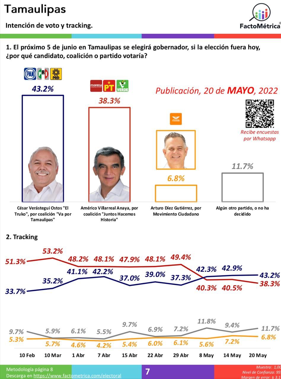 En la semana número siete de la campaña electoral, la encuestadora coloca a Truko de la Coalición “Va por Tamaulipas” en primer lugar con el 43.2 por ciento de la intención del voto, seguido de Américo Villarreal, de Morena con e 38.3 por ciento, en tercer lugar están los indecisos con el 11.7 y al final aparece Arturo Diez con el 6.8 por ciento.