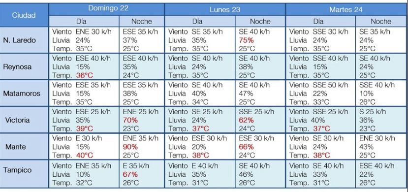 Ciudad Victoria, Tamaulipas. – Temperaturas superiores se prevén este fin de semana para algunos municipios de Tamaulipas.