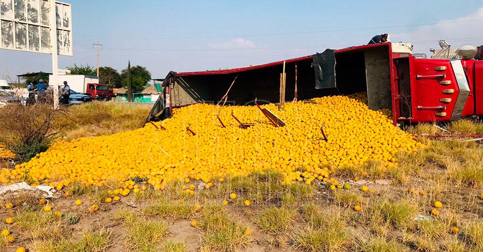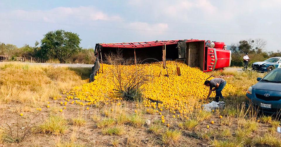 Ciudad Victoria, Tamaulipas. - Un camión cargado con varias toneladas de naranja volcó esta tarde en el kilómetro 2 de la carretera federal 101, tramo Victoria-Jaumave.