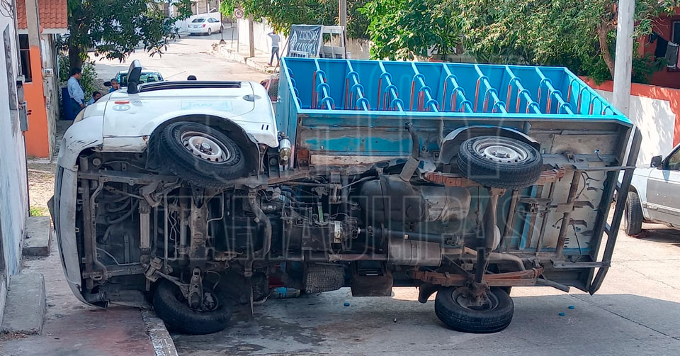 En el sitio el camión color blanco que transportaba garrafones de plástico con agua purificada, estaba semi-volcado sobre un automóvil Chevrolet color rojo con placas de circulación de la Unión Campesina democrática.