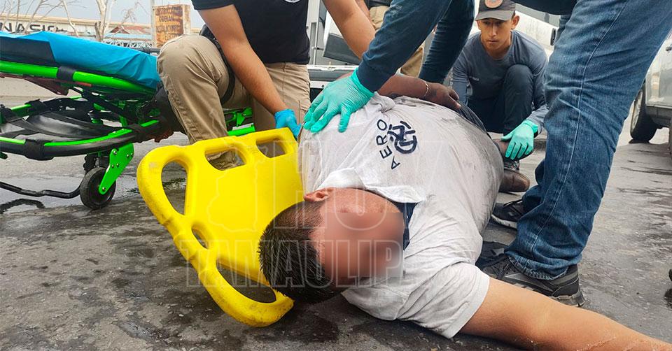 Manuel, empleado de Jomar Refaccionarias, fue auxiliado por paramédicos de Protección Civil y Bomberos, quienes lo trasladaron al Hospital del Seguro Social.