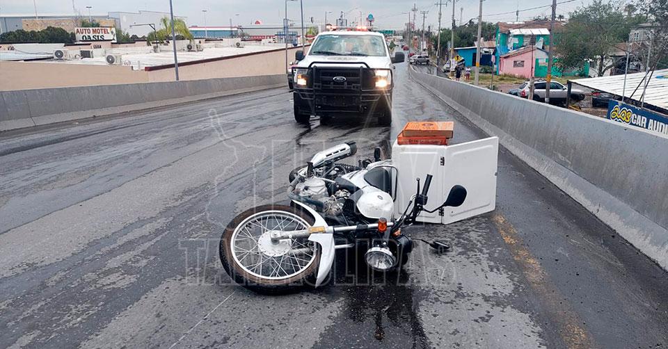 Nuevo Laredo, Tamaulipas. - Un motociclista resultó herido al derrapar en el puente vehicular de la colonia 20 de Noviembre, al poniente de Nuevo Laredo, por viajar a exceso de velocidad sin importarle que el suelo estaba resbaladizo por la lluvia.