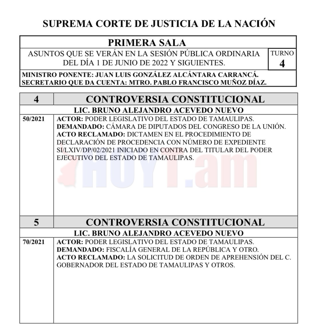 Será en la sesión de la Primera Sala de la Corte cuando los cinco ministros integrantes cuando se sometan a votación las controversias constitucionales 50/2021 y 70/2021 promovidas por el Congreso de Tamaulipas en contra de desafuero, y la orden de aprehensión en contra del gobernador.