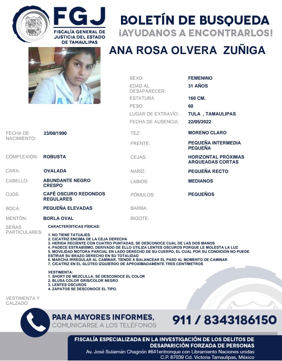 Se trata de Ana Rosa Olvera Zúñiga quien, de acuerdo al boletín de búsqueda emitido por la Fiscalía General de Justicia de Tamaulipas, desapareció en el municipio de Tula el pasado 22 de mayo del presente año.