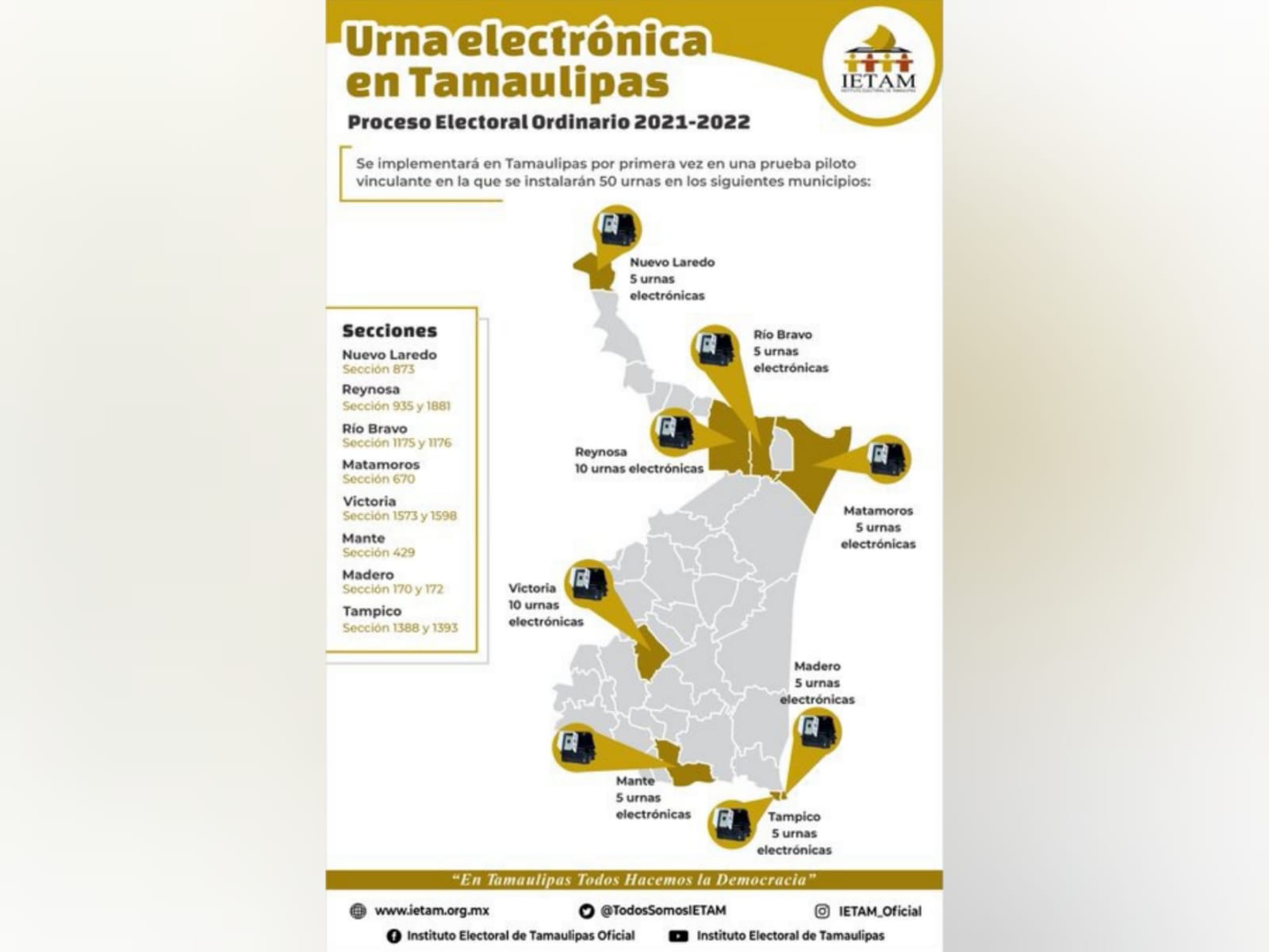 El IETAM informó que en Nuevo Laredo las urnas electrónicas estarán en la sección 873, en Reynosa en las secciones 935 y 1881, en Río Bravo en las secciones 1175 y 1176, y en Matamoros en la 670.