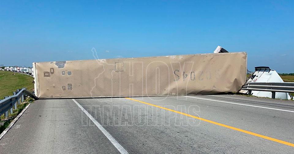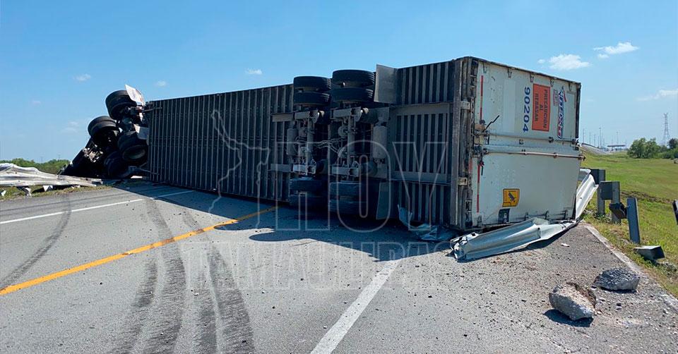 Sin embargo, el conductor perdió el control en una curva y terminó volcado, cayendo la caja sobre los carriles de circulación y el tracto sobre los barandales de contención.