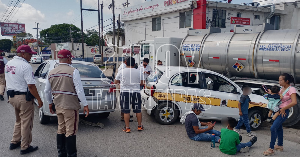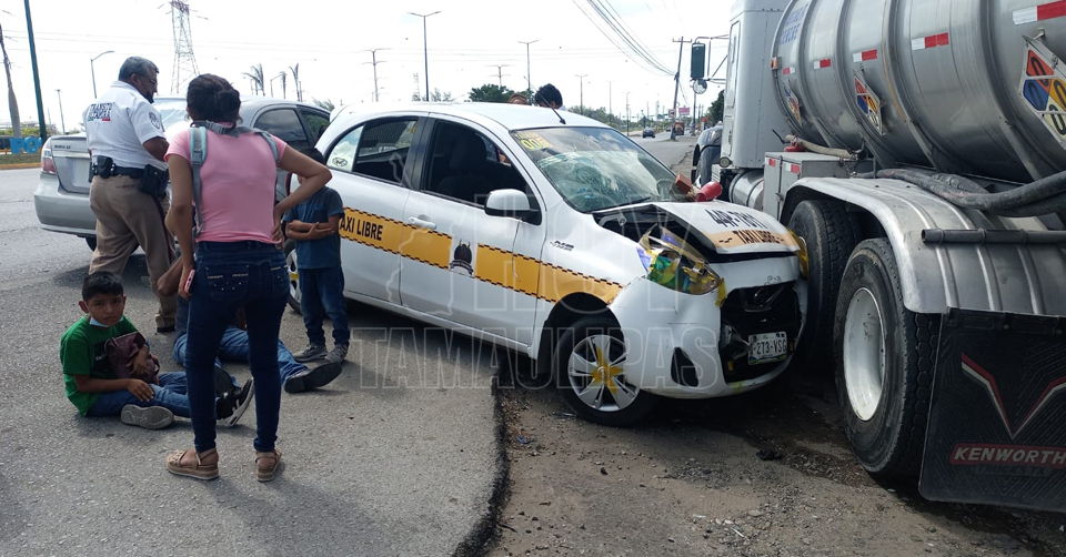 Altamira, Tamaulipas. - Cuatro integrantes de una familia, entre ellos dos menores de edad, resultaron lesionados, al ser impactado el taxi en el que viajaban por un carro particular en el que viajaba una mujer de la tercera edad que también resultó afectada, y proyectado contra un tráiler que se encontraba en posición estática a un costado del camino.