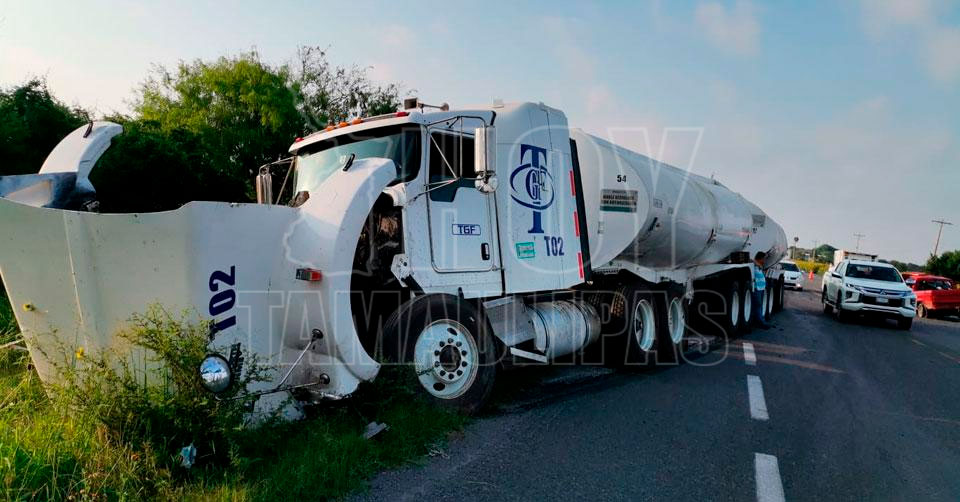 El segundo vehículo involucrado es una pipa con dos autotanques de la empresa TGF, la cual chocó de frente contra la camioneta desconociéndose hasta ahora al conductor responsable.