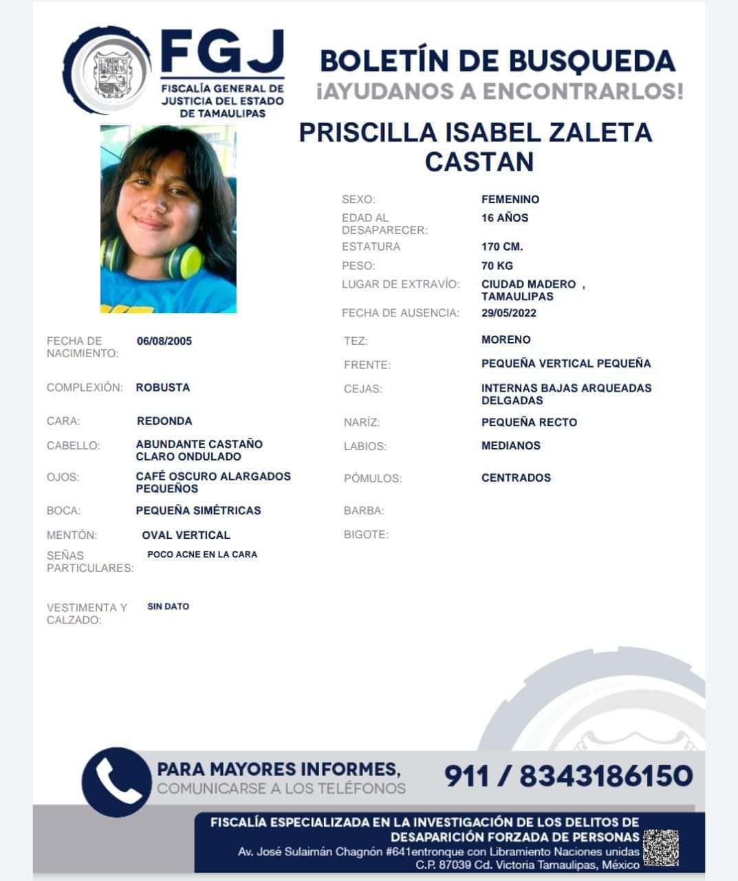 Ciudad Madero, Tamaulipas. - La Fiscalía General de Justicia del Estado de Tamaulipas emitió un boletín de búsqueda para localizar a Priscila Isabel Zaleta Castan, de 16 años de edad.