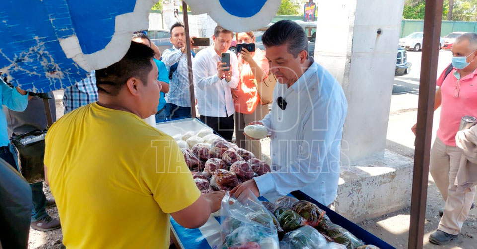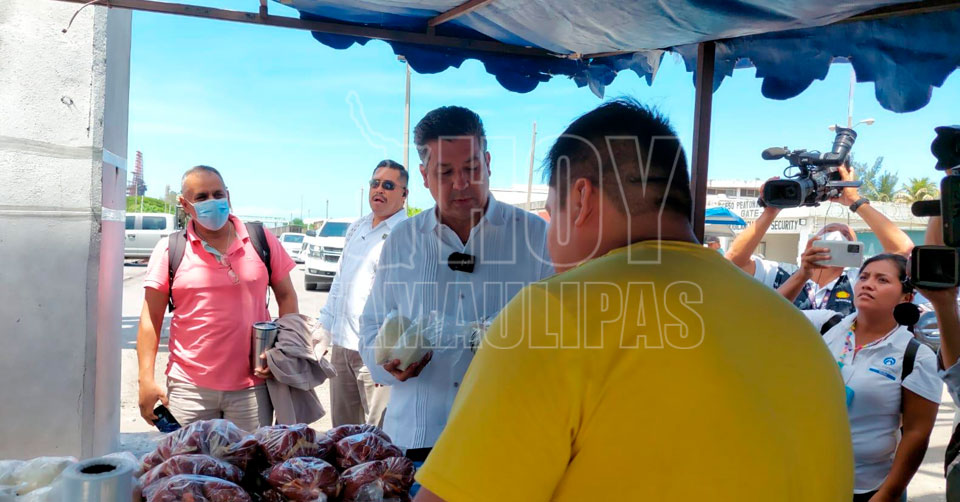 Antes de retirarse, Cabeza de Vaca se dio el tiempo de saludar a trabajadores de Pemex y hasta comprar medio kilo de queso asadero y carne enchilada.