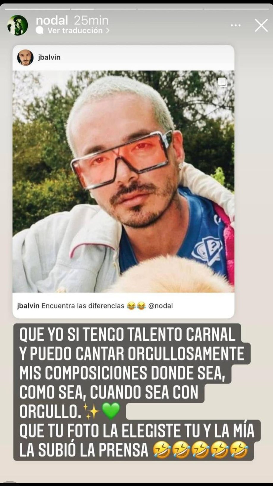 Todo empezó cuando JBalvin compartió dos imágenes donde comparaban a Nodal con él, pues el nuevo look del cantante de regional montano es algo parecido al del reguetonero; "Encuentra las diferencias Christian Nodal", escribió J Balvin para acompañar la publicación que dio a conocer en su cuenta de Instagram.