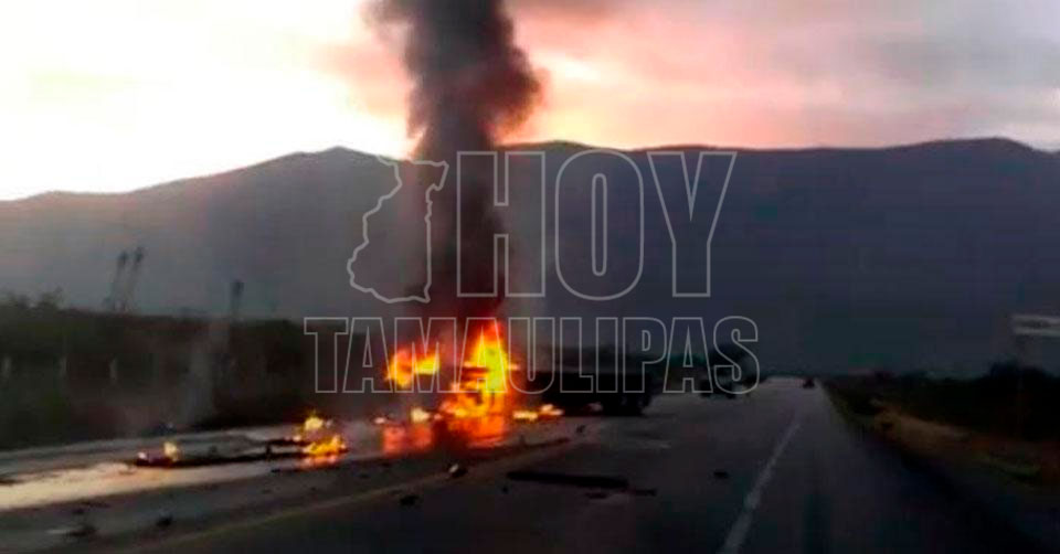 Palmillas, Tamaulipas. - Un tractocamión articulado con dos plataformas quedó reducido a cenizas esta mañana, luego de chocar contra otra pesada unidad e incendiarse en la Tula-Victoria, resultando el operador ileso.
