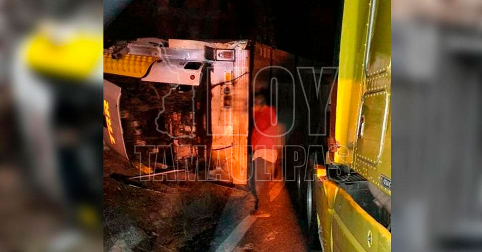 Tula, Tamaulipas. - El exceso de velocidad con que manejaba su tráiler fue la causa para que el chofer perdiera el control del volante y terminara por volcar, después de estrellarlo contra el talud de una sierra en la carretera Tula-Ocampo.