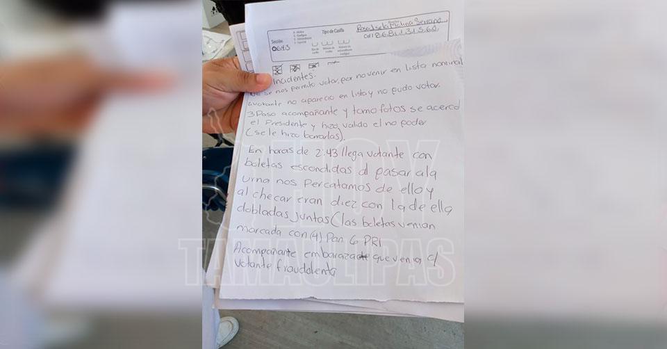 Matamoros, Tamaulipas. – Una mujer fue sorprendida cuando pretendía agregar boletas extras con votos a favor del Partido Acción Nacional (PAN) y del Partido Revolucionario Institucional (PRI) en la casilla 0643 ubicada en la colonia Sección 16 de Matamoros; hecho que fue denunciado por el representante del partido Morena.