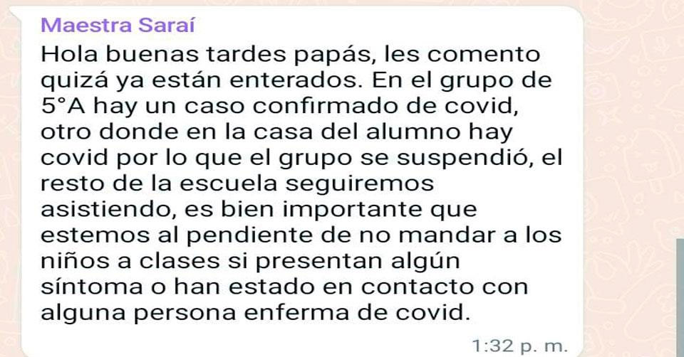 “Hola buenas tardes papás, les comento quizá ya están enterados. En el grupo de 5A hay un caso confirmado de covid, otro donde en la casa del alumno hay covid por lo que el grupo se suspendió, el resto de la escuela seguiremos asistiendo, es bien importante que estemos al pendiente de no mandar a los niños anclase si presentan algún síntoma o han estado en contacto con alguna persona enferma de covid”, se lee en el mensaje enviado a un grupo de WhatsApp por una maestra.