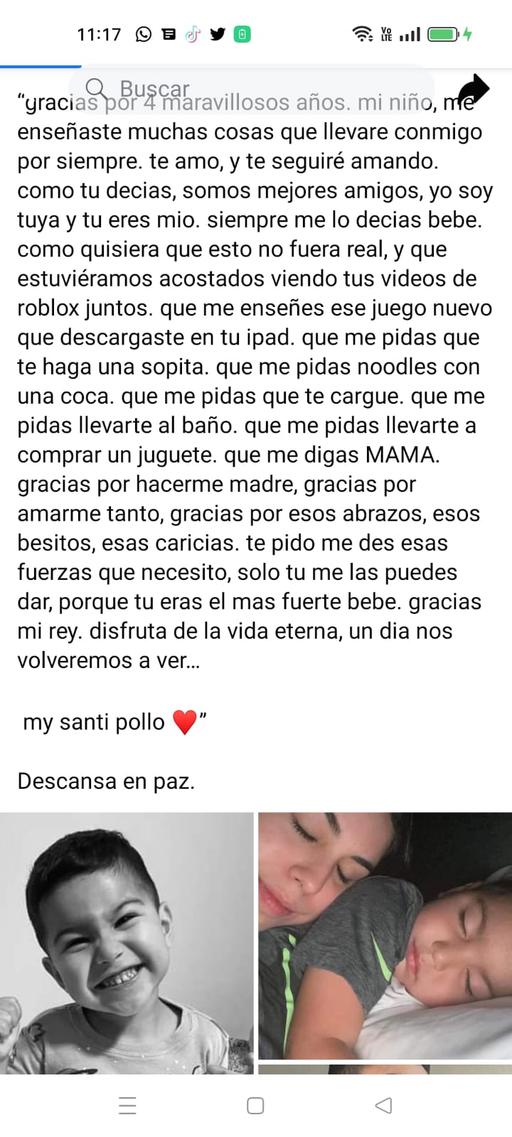 "Gracias por cuatro maravillosos años, mi niño, me enseñaste muchas cosas que llevare conmigo por siempre. Te amo, y te seguiré amando. como tu decías, somos mejores amigos, yo soy tuya y tu eres mio. siempre me lo decías bebe. Como quisiera que esto no fuera real, y que estuviéramos acostados viendo tus videos de roblox juntos, que me enseñes ese juego nuevo que descargaste en tu Ipad, que me pidas que te haga una sopita, que me pidas noodles con una coca. Que me pidas que te cargue, que me pidas llevarte al baño, que me pidas llevarte a comprar un juguete, que me digas MAMA".