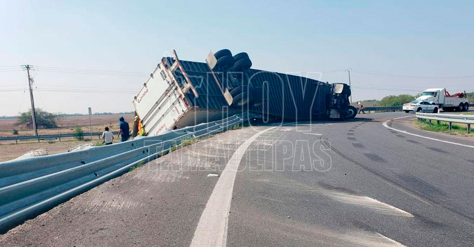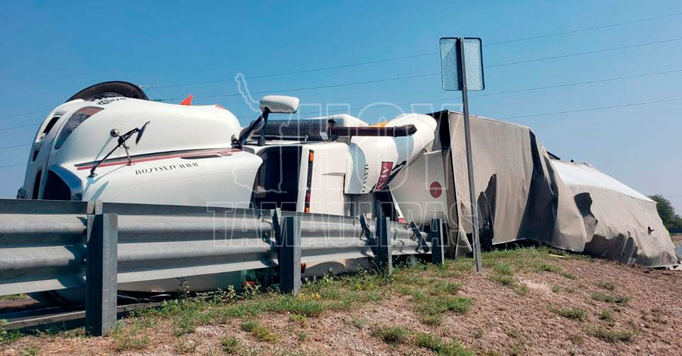 Ciudad Victoria, Tamaulipas. - Un tráiler cargado con miles de litros de jarabe de agave procedentes de Jalisco, volcó esta mañana en el circuito vial ubicado en el kilómetro 63 de la carretera Zaragoza-Victoria.