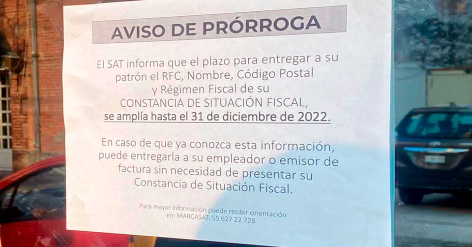 Ciudad Victoria, Tamaulipas. – El Servicio de Administración Tributaria (SAT) otorgó una prórroga hasta el 31 de enero de 2023 para que los contribuyentes entreguen la Constancia de Situación Fiscal a sus patrones.