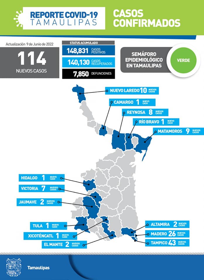 Ciudad Victoria, Tamaulipas. – Un total de 114 nuevos contagios de Covid-19 y ninguna muerte por complicaciones graves de la enfermedad se reportaron este jueves en Tamaulipas, informó la Secretaría de Salud Estatal.