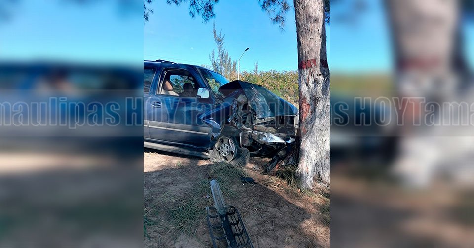 Ciudad Madero, Tamaulipas. - Una mujer lesionada y cuantiosos daños materiales dejó como saldo el fuerte choque escenificado por el conductor de un automóvil Sentra y una camioneta con placas de Estados Unidos, unidad que terminó proyectada contra un árbol.