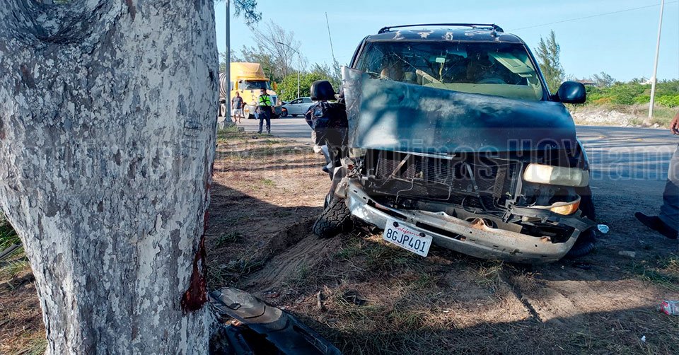 A su paso impactó en el costado izquierdo a una camioneta Chevrolet Suburban color azul marino con placas del Estado de California, cuyo operador perdió el control del volante y se proyectó de frente contra un árbol.