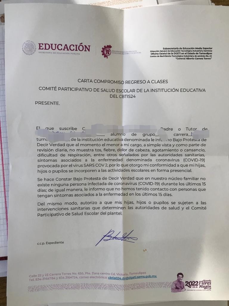 En la hoja, tanto el alumno como el padre están de acuerdo en el regreso a clases, y que no hay contagio de Covid en sus casas.