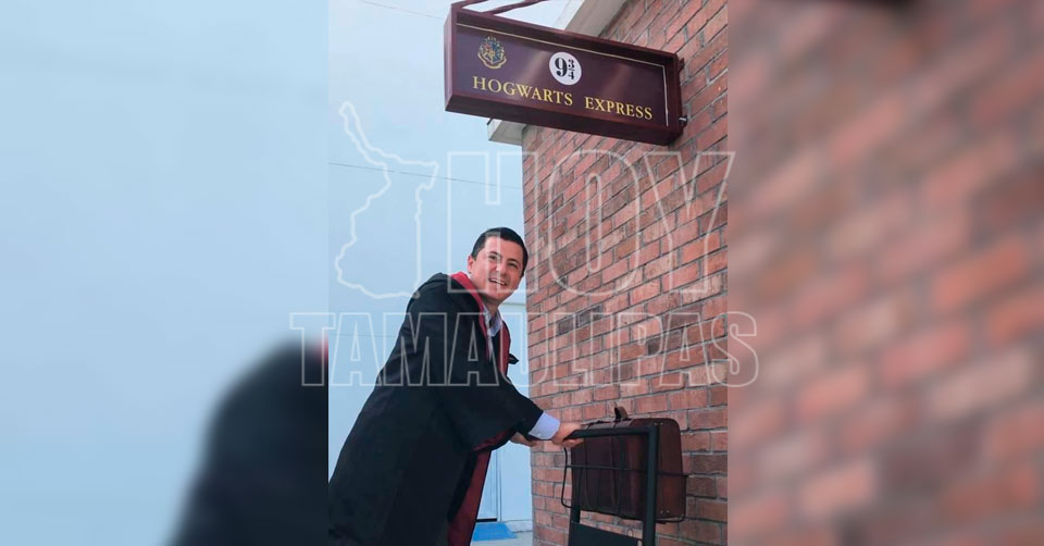 Nuevo Laredo, Tamaulipas. - A iniciativa de los estudiantes de la Universidad Tecnológica de Nuevo Laredo, se colocó a manera de homenaje el Andén 9 ¾ en alusión a la saga de Harry Potter.
