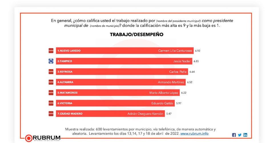 Por otro lado, en una medición sobre el desempeño de los alcaldes tamaulipecos, Rubrum posiciona a la presidenta municipal de Nuevo Laredo en primer lugar con un promedio del 6.92.