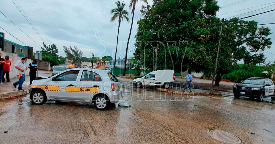 En el percance vial participaron un automóvil Nissan March color blanco con franja amarilla habilitado como taxi, así como una camioneta color blanco, misma que del impacto fue proyectada contra la banqueta y un poste.