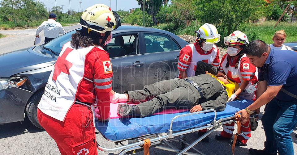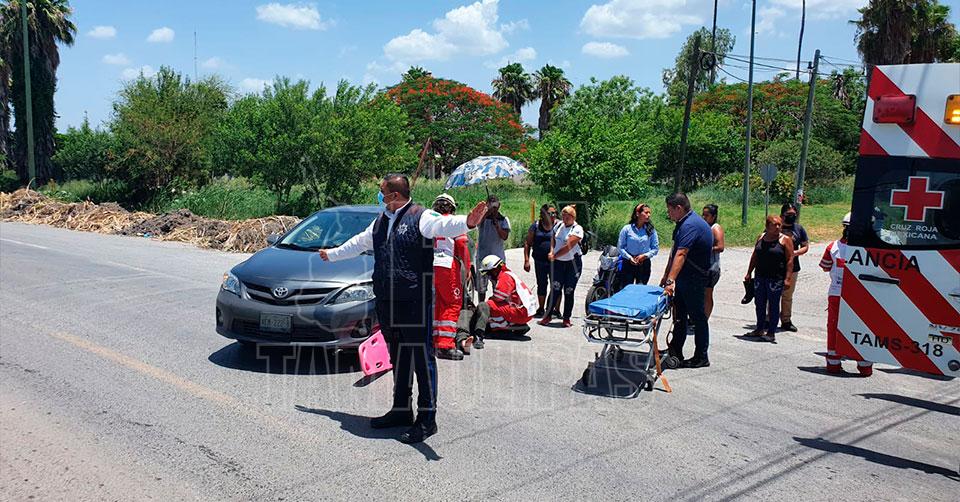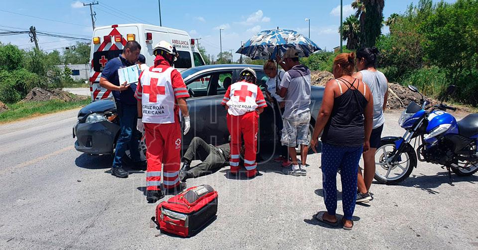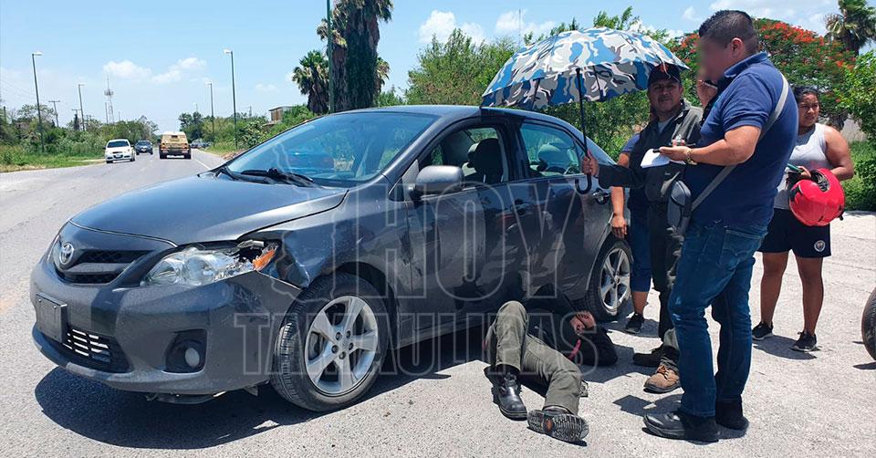 El accidente se registró cuando el conductor de un automóvil Toyota y empleado del IMSS salió por la calle Misión España en sentido de poniente a oriente y al incorporarse a la carretera vieja a El Mante embistió al motociclista.