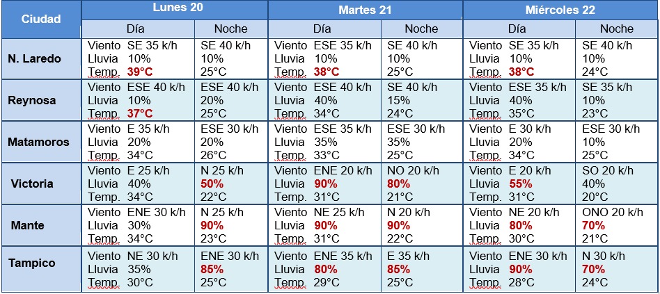 Ciudad Victoria, Tamaulipas. – A partir de este lunes en el sur y centro de Tamaulipas se pronostica una alta probabilidad de lluvia de moderada a fuerte puntual, esta estará acompañado de viento moderado de dirección este noreste y tormentas eléctricas en algunas zonas, informó Protección Civil Estatal.