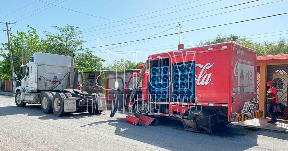 El Mante, Tamaulipas. – Un empleado de una empresa repartidora de agua purificada resultó gravemente lesionado este mediodía, tras ser aplastado junto al camión que conducía por un tracto camión, cuyo chofer iba distraído en el celular.