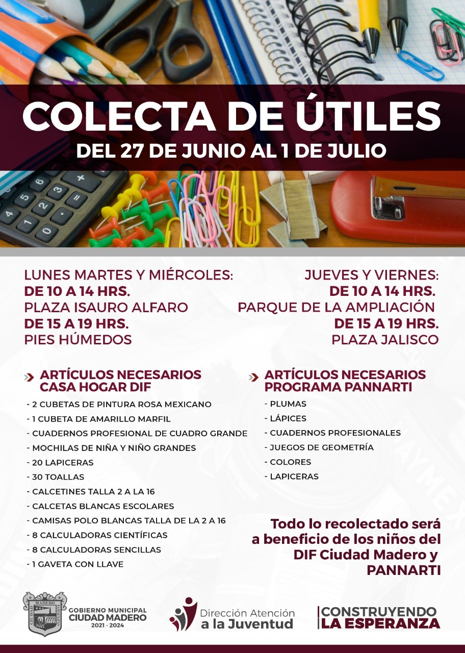 Ciudad Madero, Tamaulipas. - Del 27 de junio al 1 de julio, el Gobierno de Ciudad Madero, a través de la Dirección de Atención a la Juventud, llevará a cabo una colecta de útiles escolares, con el propósito de apoyar a los niños de la Casa Hogar del Sistema DIF local y del Programa de Prevención y Atención del Trabajo Infantil (PANNARTI) en el regreso a clases.