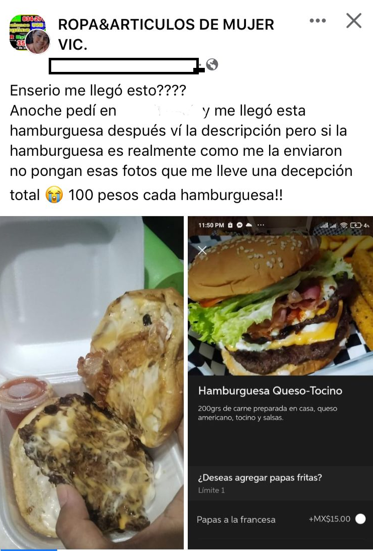 “Enserio me llegó esto???? Anoche pedí en ##### y me llegó esta hamburguesa después vi la descripción, pero si la hamburguesa es realmente como me la enviaron no pongan esas fotos que me llevé una decepción total 100 pesos cada hamburguesa!!”, escribió la furiosa mujer.