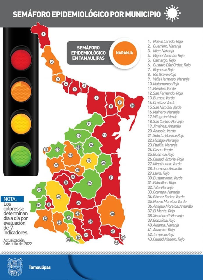 El semáforo epidemiológico en el Estado se encuentra en color naranja, al ser 16 municipios los que están en color rojo, entre ellos la capital de Tamaulipas, Ciudad Victoria, Nuevo Laredo, Reynosa, Matamoros, San Fernando, Soto la Marina, Tampico, Madero y Altamira.