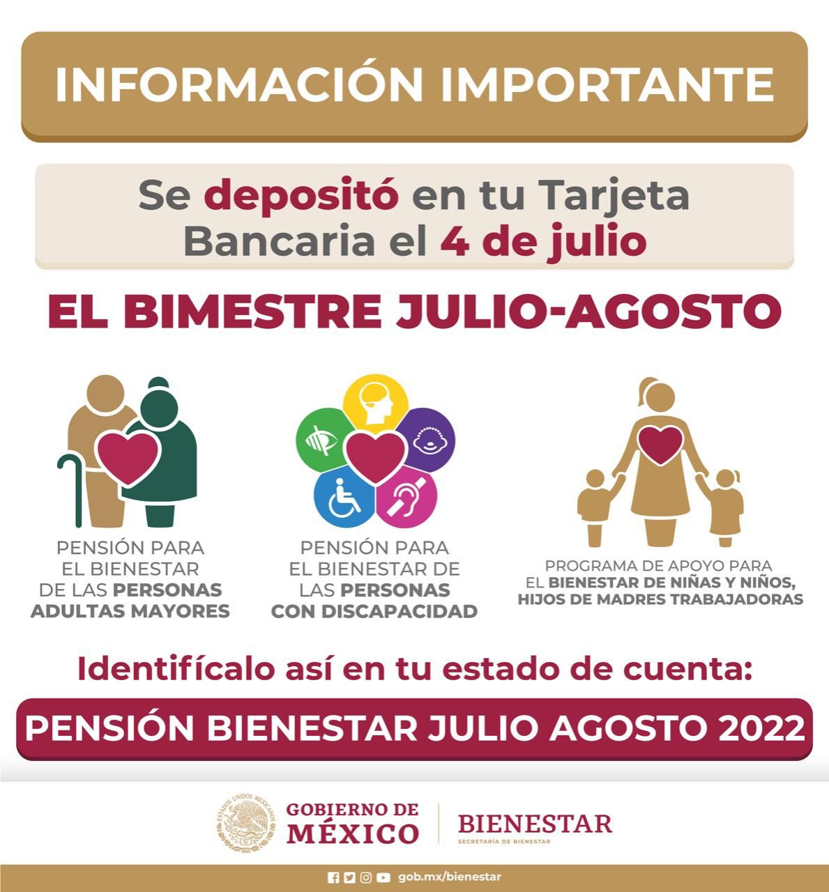 Ciudad de México. -Desde este lunes 4 de julio, la Secretaría de Bienestar inició la dispersión a 12.1 millones de derechohabientes y beneficiarios que cobran a través de tarjetas bancarias y en operativos de pago en las comunidades donde carecen de bancos, la inversión social será de 50 mil 830 millones de pesos de las Pensiones y programas de Bienestar correspondientes al bimestre julio-agosto de 2022.