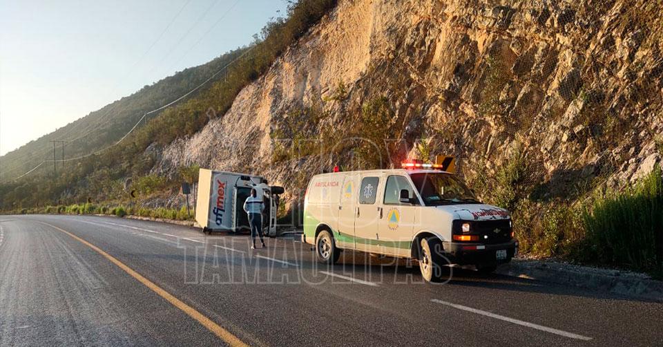 Vuelca camión de paquetería en la carretera Tula-Victoria; dos lesionados