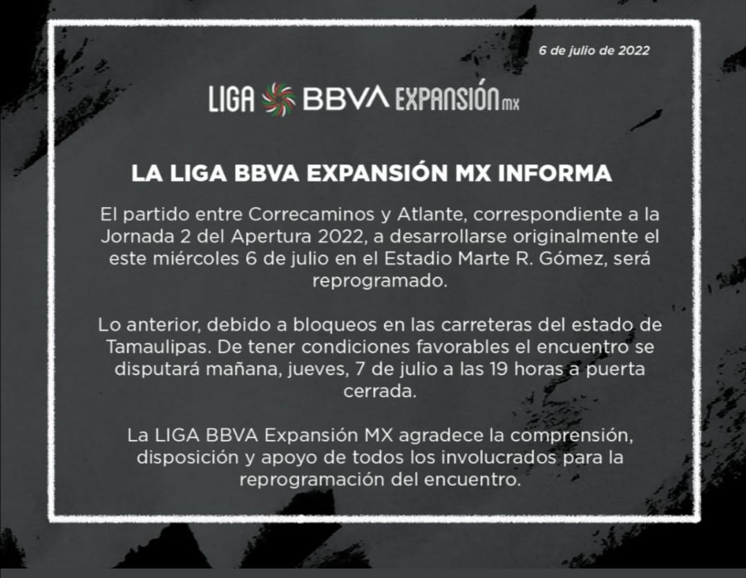 “Lo anterior debido a bloqueos en las carreteras del Estado de Tamaulipas. De tener condiciones favorables el encuentro se disputará mañana, jueves siete de julio a las 19:00 horas a puerta cerrada”, reza el comunicado.
