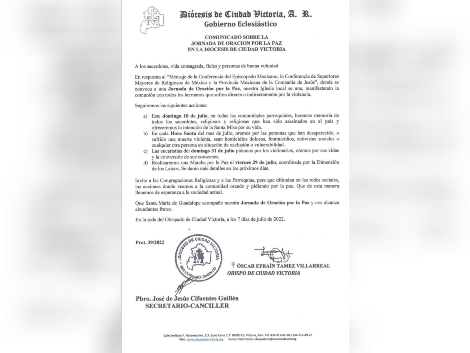 El comunicado del obispo también señala que el viernes 29 de julio se realizará una Marcha por la Paz que será “coordinada por la Dimensión de los Laicos. Se darán más detalles en los próximos días”