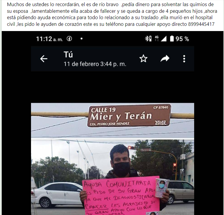 Ciudad Victoria, Tamaulipas. - En redes sociales piden ayuda para un señor que perdió a su esposa a causa del cáncer, ahora debe regresar a Río Bravo de donde es originario con sus cuatro hijos quienes quedaron a su cuidado.