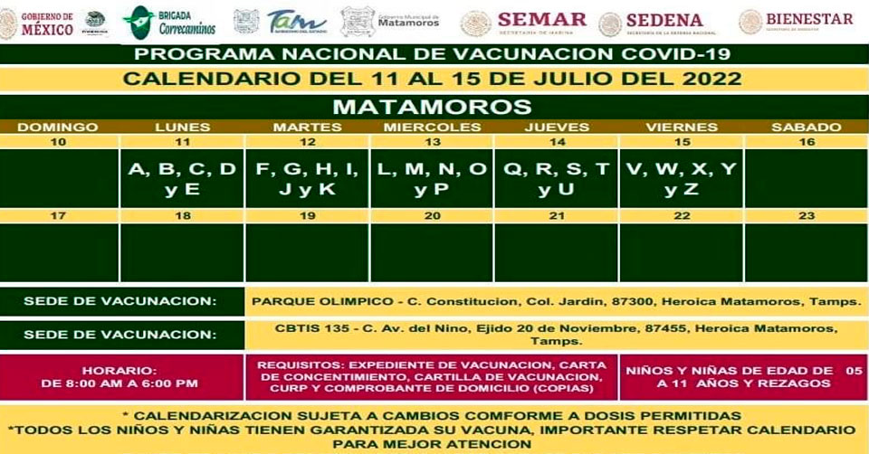 Matamoros, Tamaulipas. - A partir de este lunes 11 de julio se estará dando inicio a la jornada de vacunación contra la Covid-19 para menores de 5 a 11 de años de edad en Matamoros, teniendo como sedes el Parque Olímpico y el CBTis135 en un horario de 8:00 de la mañana a 6:00 de la tarde.