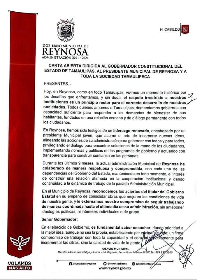 En la carta los integrantes del Cabildo de Reynosa expresan el siguiente extracto: