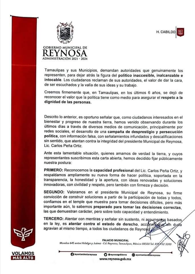 Dentro de los puntos redactados en la carta firmada por los integrantes del Cabildo de Reynosa, en apoyo al presidente municipal se reconoce la capacidad profesional, convicción de trabajo y gobernar de manera incluyente y en unidad por parte de Peña Ortiz.