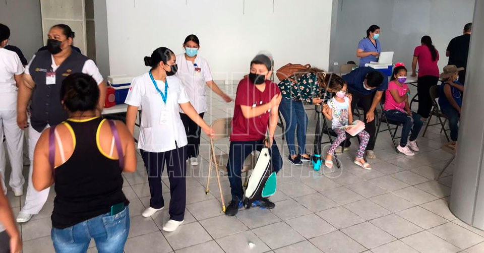 Matamoros, Tamaulipas.- Padres de familia junto a sus hijos, de entre cinco a 11 años de edad, llegaron desde las 5:00 de la mañana a los módulos de vacunación contra el Covid-19 en Matamoros, con la finalidad de ser los primeros en recibir dicha inmunización.