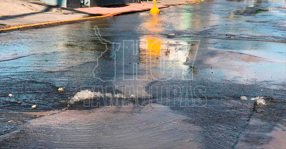 Matamoros, Tamaulipas. - A escasas horas de haber controlado la mega fuga de agua en el cruce de la Canales y Guillermo Domínguez, este miércoles surgió una nueva en la calle Juárez entre 4 y 5 en Matamoros.