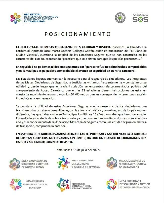 A diferencia del legislador local que desconoce la operatividad de las estaciones seguras en Tamaulipas, quienes conforman estas mesas le dejaron claro que la utilidad es constatada por la ciudadanía, aunado al evidente avance en seguridad carretera en lo cual han contribuido estos espacios.
