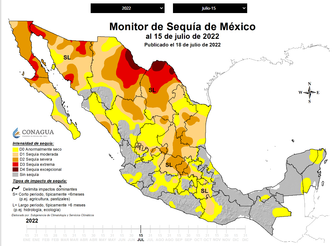 Se trata del Monitor de Sequía en México, que consta de un reporte que contiene una descripción de la sequía en el país, tablas y gráficos de porcentaje de área afectada por sequía a nivel nacional, estatal, además de la contabilidad de municipios afectados por cualquier categoría de sequía.
