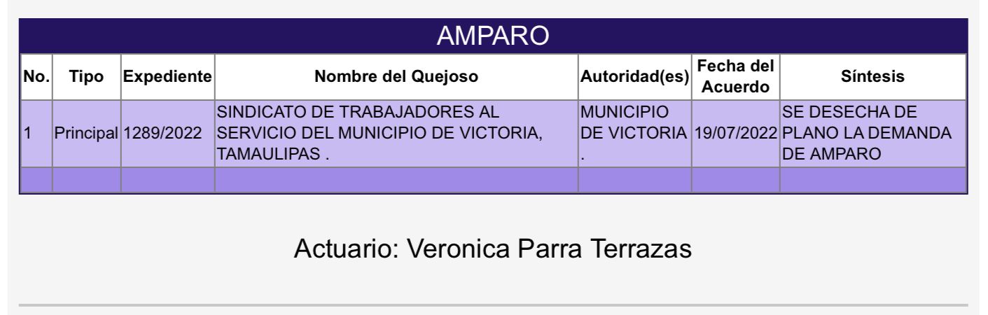Fue el 20 de julio cuando el acuerdo tomado por el juez Décimo Primero de Distrito de del Décimo Noveno Circuito del Poder Judicial de la Federación se agregó al cuadernillo principal 1289:2022, argumentando lo siguiente; “Se desecha de plano la demanda de amparo”, esto en respuesta a la demanda presentada ante dicho juzgado federal por el Sindicato de Trabajadores al Servicio del Municipio de Victoria.