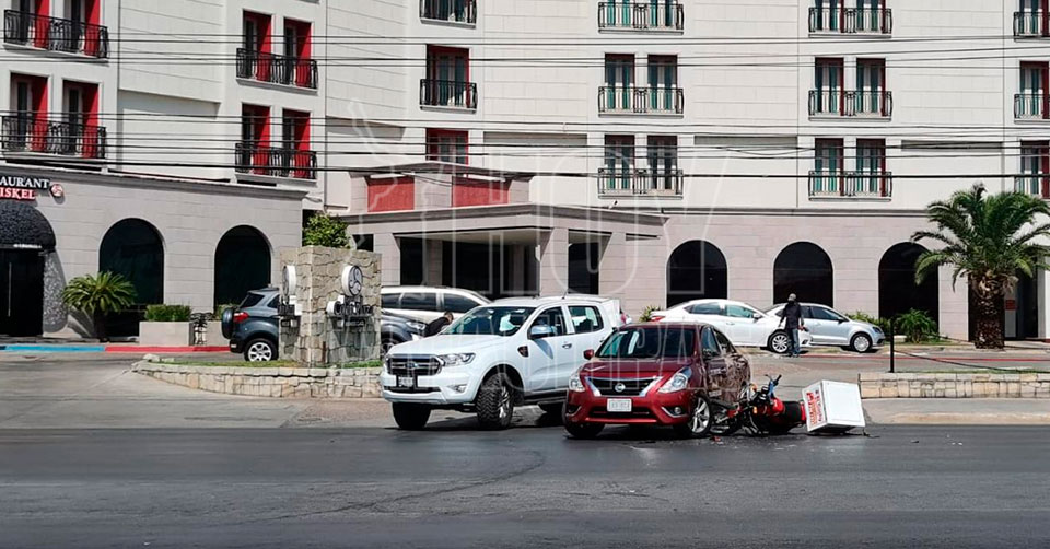 El automóvil, que era manejado por una mujer de momento no identificada, salía de las instalaciones del hotel ubicado en ese crucero, y recién había arrancado al tener luz verde en su semáforo.