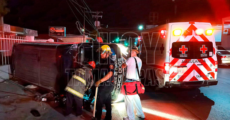 Se trata de una Nissan Urvan modelo 2018, que iba de poniente a oriente, y en la que viajaban al menos cinco personas; del impacto sufrió la volcadura, quedando en una de las esquinas.